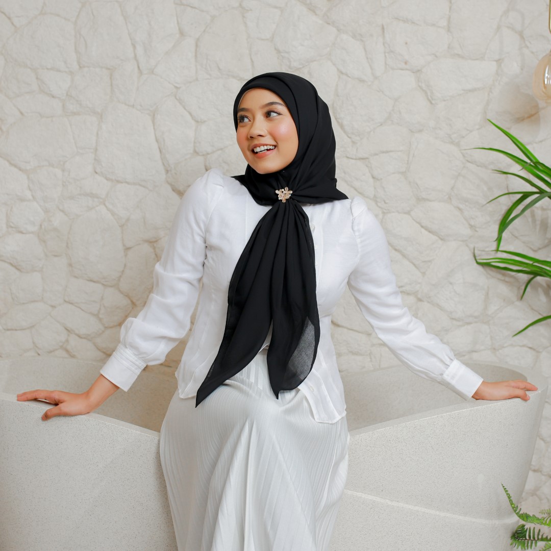 Finishing jahit tepi rapi menambah kesan clean, dipadukan dengan detail logo printing Zoya pada ujung kerudung sebagai signature khas yang membuat tampilan semakin eksklusif.