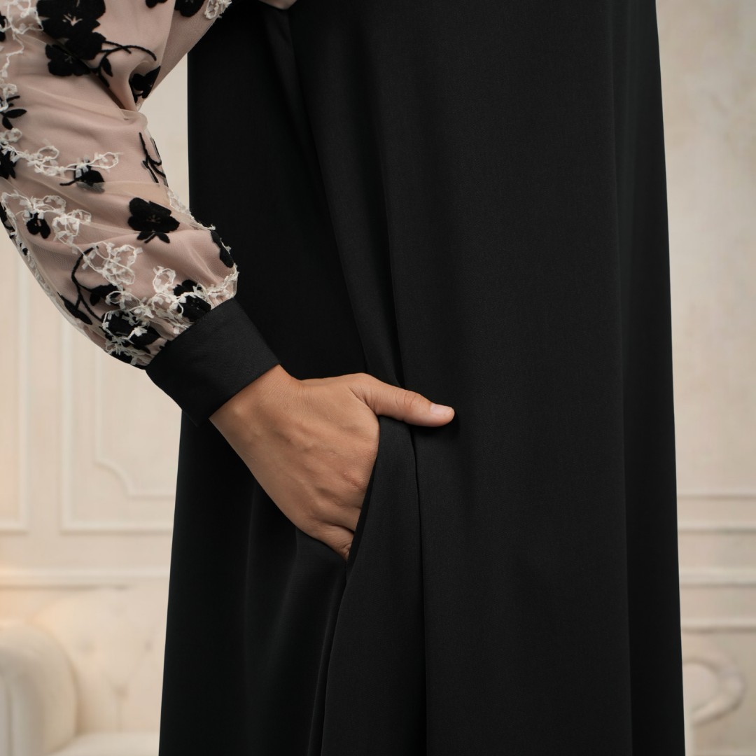 Karakteristik kain ringan, permukaan kain utama halus, serat kain utama & padanan berongga, permukaan kain padanan menerawang & memiliki detail flower beludru juga embroidery pita, jatuh flowy, nyaman.