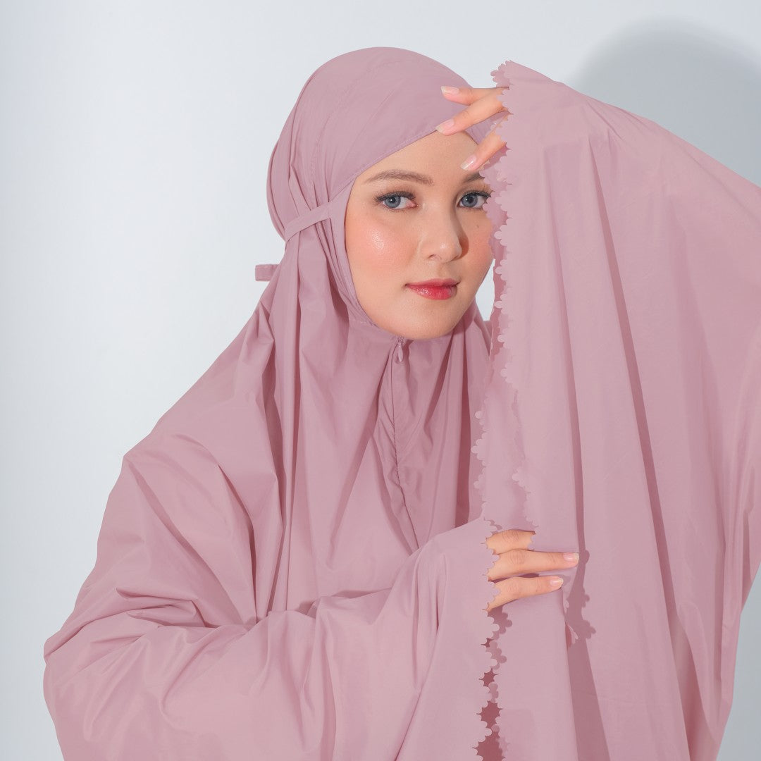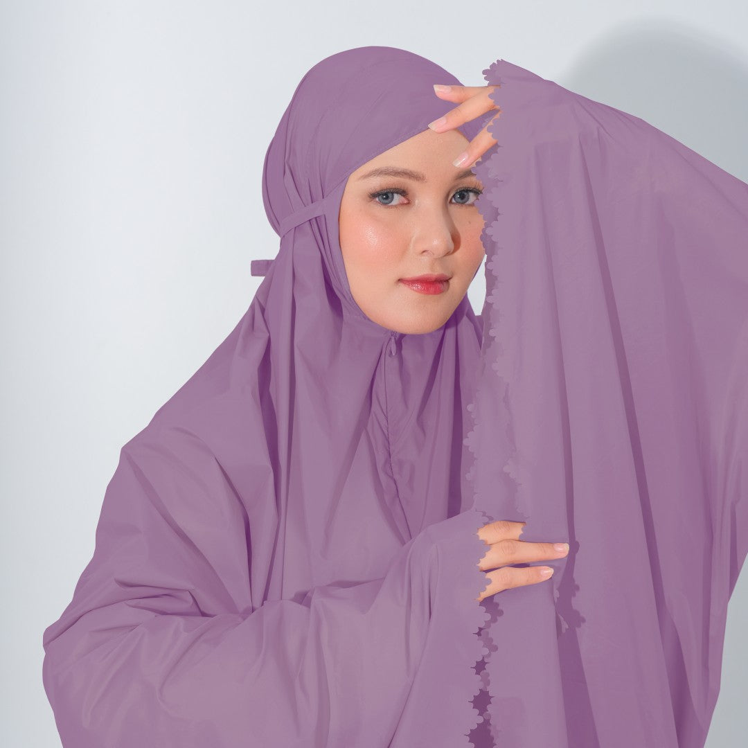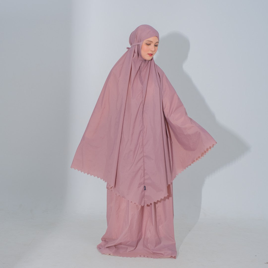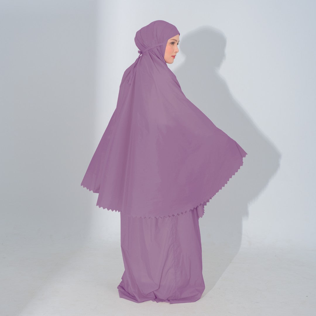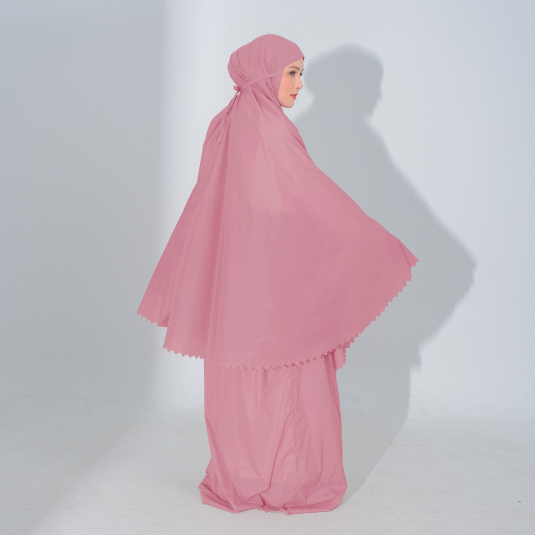 Mukena dengan zipper bagian depan dan detail laser cut, dengan bahan yang ringan sehingga cocok untuk travel. DIlengkapi juga dengan tas travel size