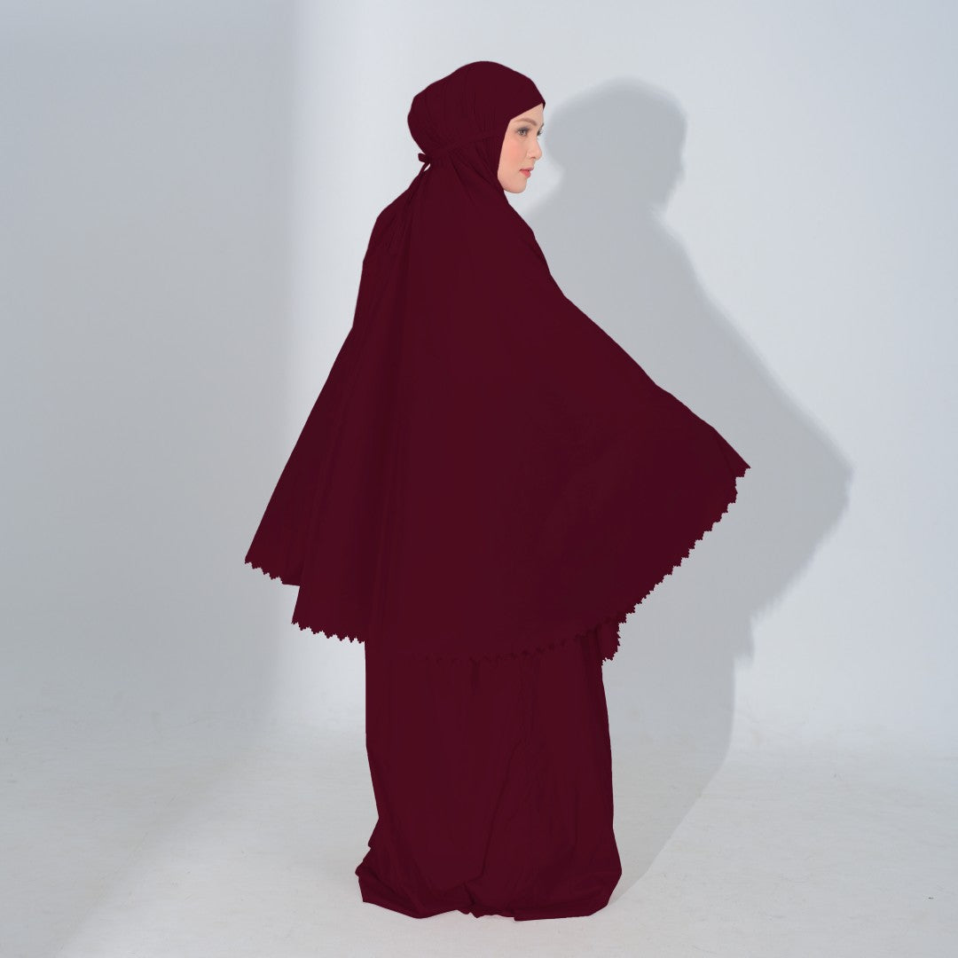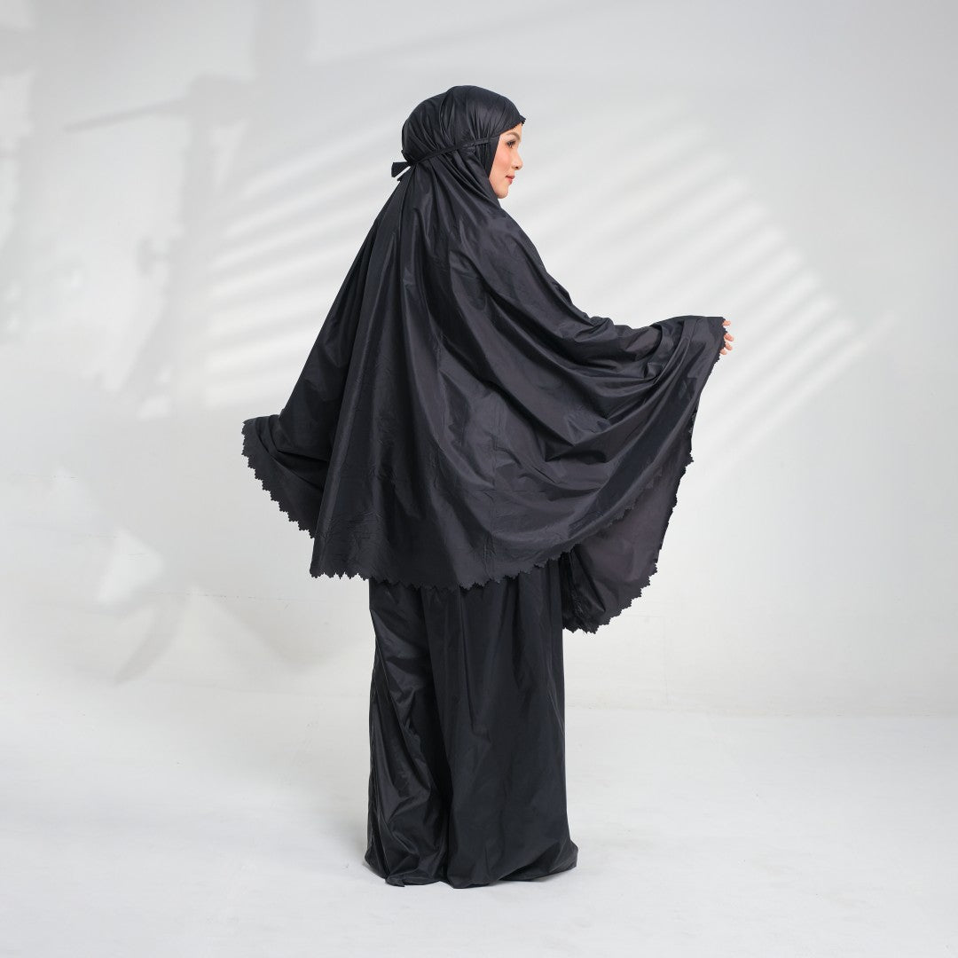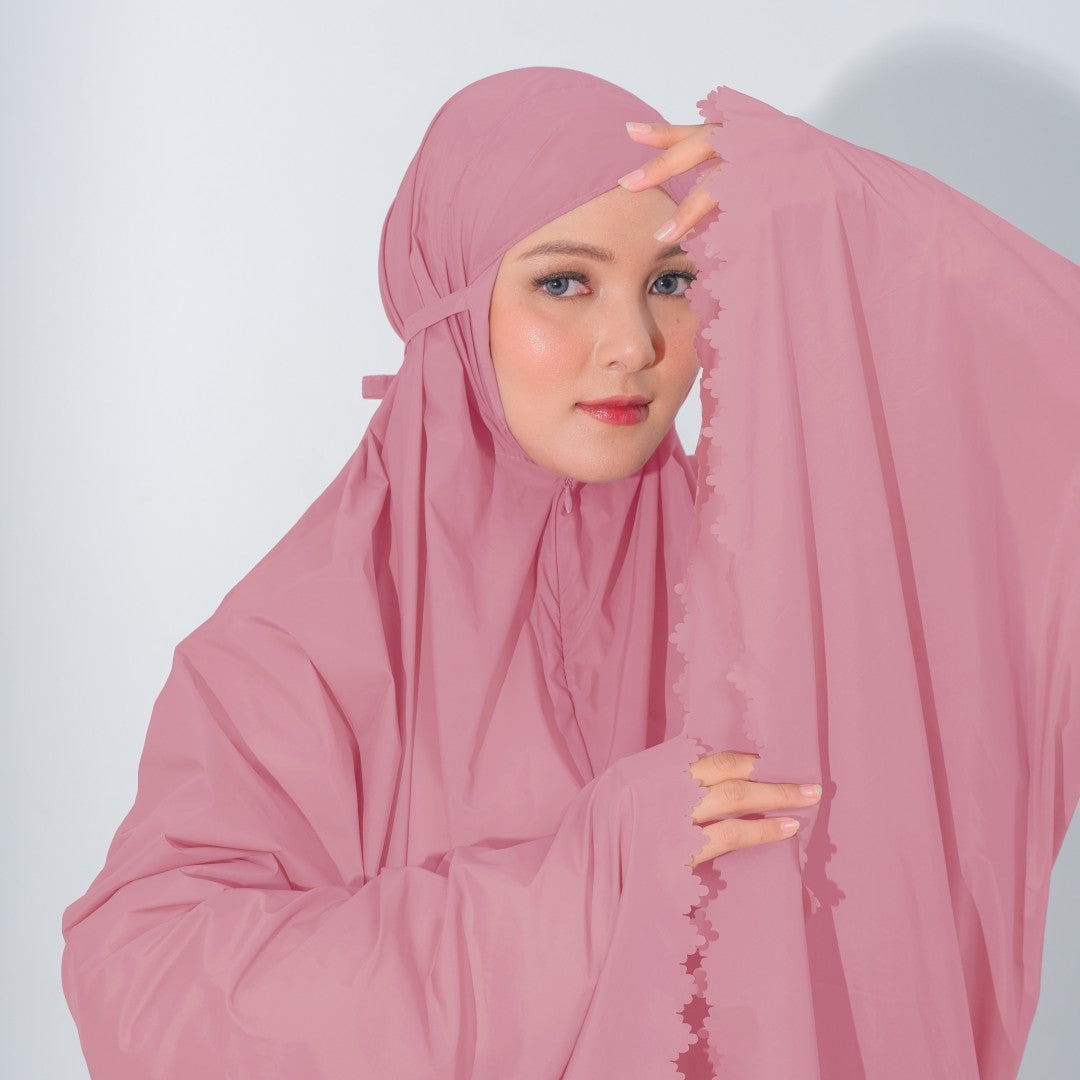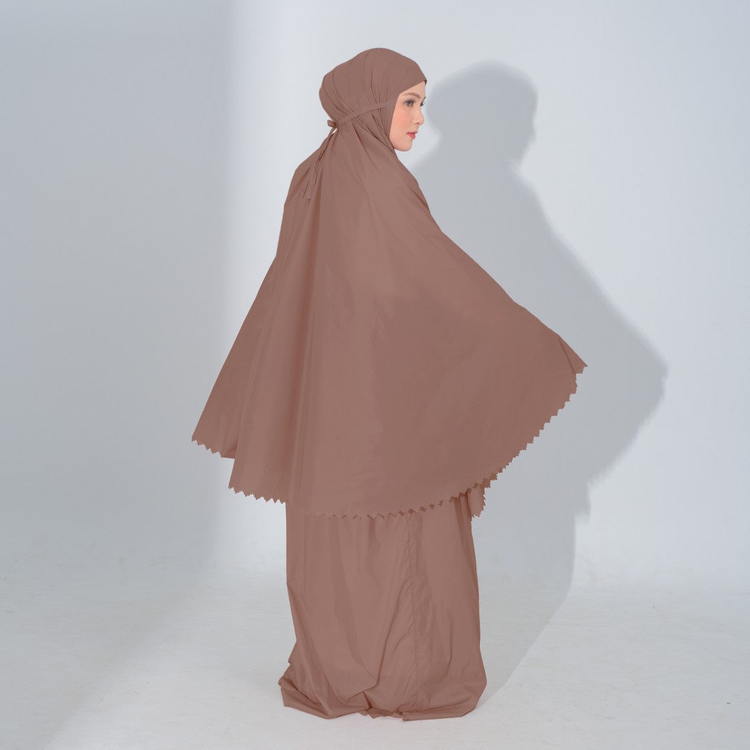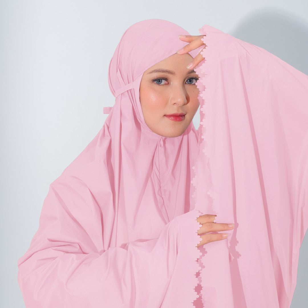 Mukena dengan zipper bagian depan dan detail laser cut, dengan bahan yang ringan sehingga cocok untuk travel. DIlengkapi juga dengan tas travel size
